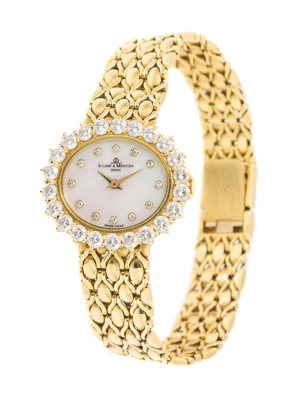 the bezel contains 22 round brilliant cut diamonds weighing approximately 2.64 carats total, 27.00 x 23.00 mm case dimensions, mother-of-pearl dial signed BAUME & MERCIER, diamond markers, gilt alpha hands, case back affixed with four screws, quartz movement, yellow gold bracelet, foldover clasp.Accompanied by a signed inner and outer box.