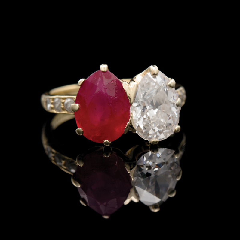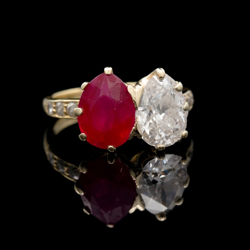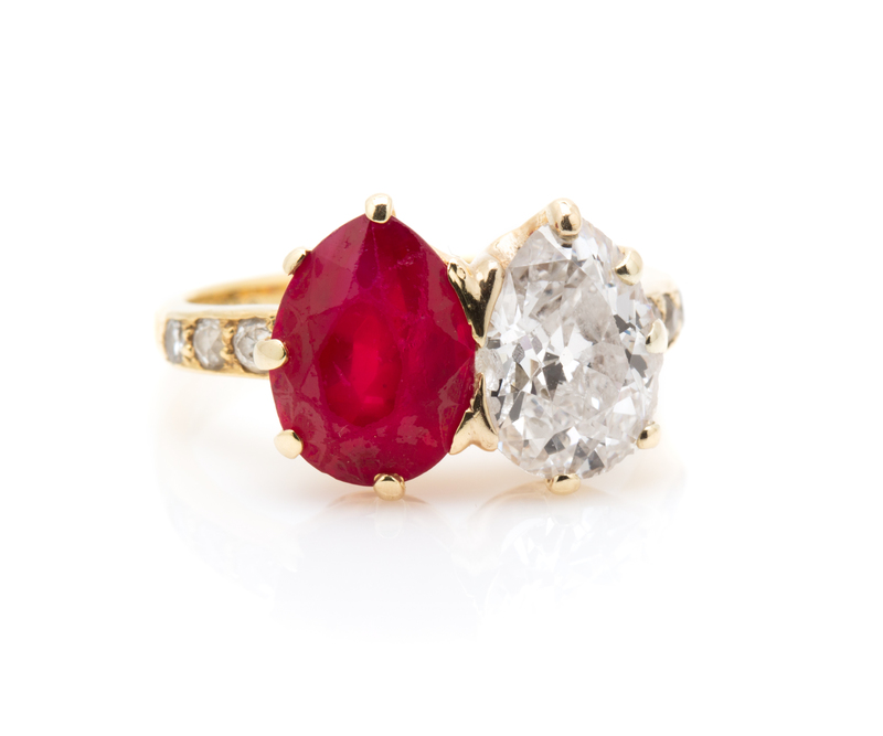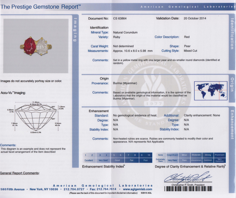 containing one antique pear shape ruby measuring approximately 10.60 x 8.00 x 5.98 mm, one antique pear shape diamond measuring approximately 10.33 x 7.70 x 4.73 mm, and six old European cut diamonds weighing approximately 0.20 carat total.Stamp: TIFFANY & Co. 750.Accompanied by an American Gemological Laboratories ruby identification and origin certificate number CS 63864, dated October 20, 2014, stating Mineral Type: Natural Corundum, Variety: Ruby, Origin: Burma (Myanmar), Enhancement: No gemological evidence of heat, Clarity Enhancement: None.NOTEOther than routine maintenance conducted by Tiffany & Co. in 2009 including re-stamping of the faded signature stamp, the ring and stones have been left in their original condition. The successful bidder may wish to have the stones professionally repolished to remove the normal signs of age and wear. Interested bidders are encouraged to contact the Fine Jewelry Department for more information regarding this process.