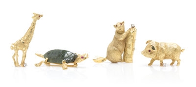 consisting of an 18 karat gold giraffe brooch containing two round cut rubies and one round brilliant cut diamond, a gold pig brooch containing two round cut rubies and one round brilliant cut diamond, an 18 karat gold beaver brooch containing two round cut rubies and one round brilliant cut diamond and one 18 karat yellow gold turtle brooch containing two round cabochon cut rubies and a nephrite shell.Turtle stamp: Cellino 750.Beaver stamp: 18K.Giraffe stamp: 18K.