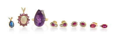 consisting of one pair of earrings containing two oval faceted rubies measuring approximately 5.05 x 3.12 mm surround by 20 round brilliant cut diamonds weighing approximately 0.20 carat total, one pair of earrings containing two oval faceted pink tourmaline 5.14 x 7.09 mm and two round brilliant cut diamonds weighing approximately 0.06 carat total, a pendant containing one oval sapphire measuring 6.00 x 8.23 mm, a pendant containing one cabochon cut opal measuring 10.12 x 8.05 mm surrounded by 12 round faceted pink sapphires, a pair of white and yellow gold earrings containing two oval mixed cut rubies and two round brilliant cut diamonds and a ring containing one pear shaped amethyst measuring 13.15 x 21.82 mm with nine single cut diamonds weighing approximately 0.09 carat total.