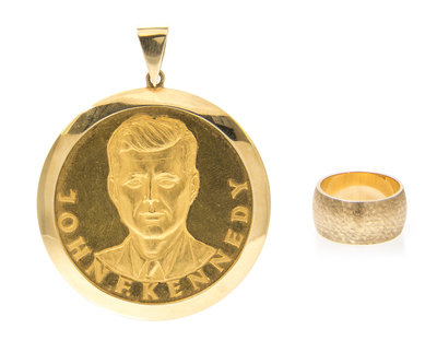 consisting of a 1963 yellow gold commemorative medallion depicting Kennedy's facade on one side and the German eagle crest on the reverse within a 14 karat yellow gold setting, together with a 14 karat yellow gold textured band.Medallion signed: HOLL.Pendant stamp: 585 CFK.