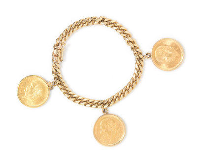 A 14 Karat Yellow Gold Charm Bracelet with Three Attached 10 Peso Coin Charms,