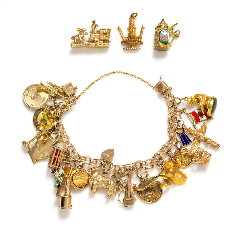 consisting of a 14 karat gold Alaska moose and train charm, a goldtone and enamel yellow rose of Texas charm, a 14 karat gold trumpet charm, a 14 karat gold Shetland sheepdog charm, a palm tree charm, a 14 karat gold and ruby Wisconsin charm, a 10 karat gold lobster trap charm, a 14 karat gold and polychrome enamel gaslight charm, a gilt silver Kentucky charm, a 14 karat gold Ladie dog charm, a 14 karat gold Mickey Mouse charm, a 14 karat gold guitar charm, a 14 karat gold Pasadena California charm, a 14 karat whale charm, a Heidelberg stein charm, a ram's head charm, a 14 karat gold Bellingham Gardens of Mobile, Alabama charm, a crown charm, a 14 karat gold oil rig charm, a 10 karat gold totem pole charm, a 10 karat gold an enamel ribbon charm, a 14 karat gold and enamel Canadian flag charm and a gold panner and jade charm.