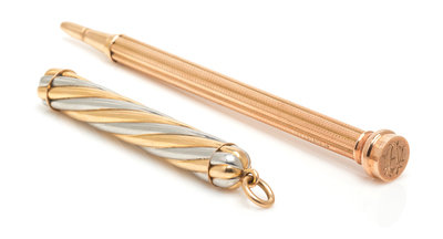 consisting of one pencil in 14 karat rose gold with phone dialer on the end, together with an 18 karat rose and white gold spiral design sliding pencil with hinged bail.Stamp: TIFFANY & CO.