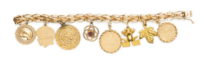 A 14 Karat Yellow Gold Charm Bracelet with Eight Attached Charms,