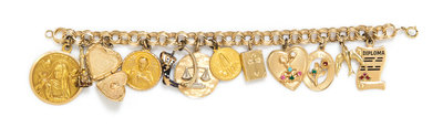 consisting of a 14 karat Sainta Rita charm, a Chicago Watertower charm, a 14 karat heart locket charm, a Lady of Mt. Carmetl charm, a converted antique enamel earring charm, a 14 karat gold balance charm, a lady of Fatima charm, a bible charm with the Lord's prayer, a 14 karat gold and gemstone heart charm, a 14 karat gold flower girl charm a 14 karat gold dove charm and a 14 karat gold diploma charm.