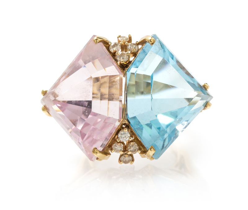 consisting of one modified step cut blue topaz measuring approximately 18.45 x 24.40 x 13.58 mm, one modified step cut pink topaz (origin of color not tested) measuring approximately 18.42 x 24.47 x 14.79 mm and eight round brilliant cut diamonds weighing approximately 0.24 carat total.