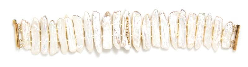 A 14 Karat Yellow Gold, Biwa Pearl and Diamond Bracelet,