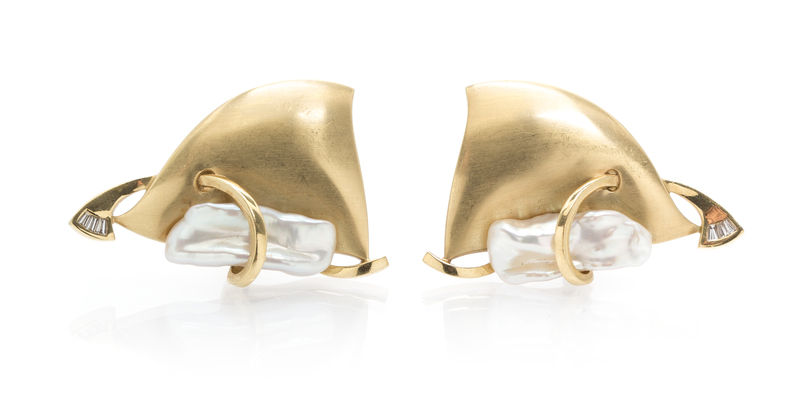 A Pair of 14 Karat Yellow Gold, Biwa Pearls and Diamond Earclips, Christine Bartling,