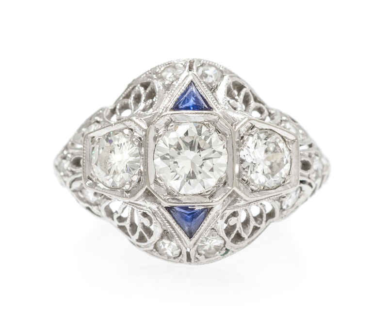 containing three round brilliant and old European cut diamonds weighing approximately 0.72 carat total, 10 round single cut diamonds weighing approximately 0.10 carat total and two triangular cut sapphires.Stamp: P6188.
