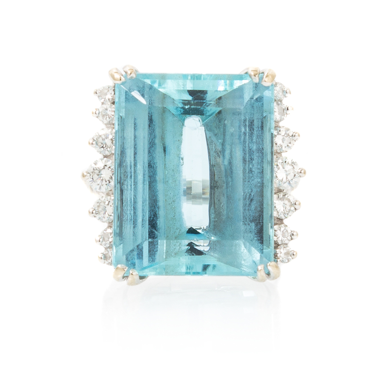 containing one octagonal step cut aquamarine measuring approximately 17.81 x 14.05 x 8.58 mm and 14 round brilliant cut diamonds weighing approximately 0.52 carat total.Stamp: G14K.