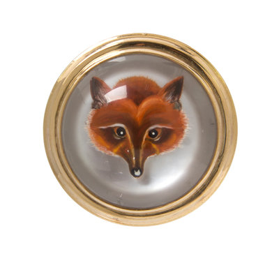 consisting of a round cabochon cut rock crystal measuring approximately 27.00 mm in diameter carved on the reverse and hand painted in a realistic fox head motif against the mother-of-pearl backing, within a fluted polished gold surround.Stamp: (Maker's mark J.E.C. CO) 14K V6125.