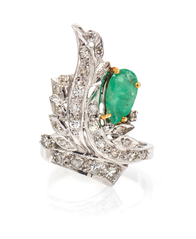 in an asymmetric openwork design, containing one pear shape emerald measuring approximately 9.25 x 5.00 mm and numerous round single cut diamonds weighing approximately 0.38 carat total.