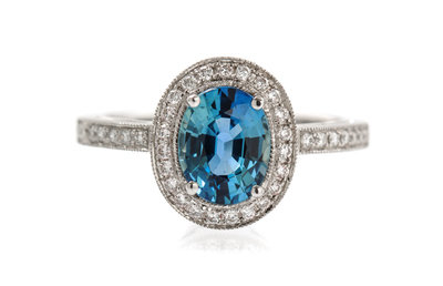 containing one oval mixed cut sapphire measuring approximately 8.34 x 6.46 x 3.94 mm and 37 round brilliant cut diamonds weighing approximately 0.13 carat total. Stamp: 18K.
