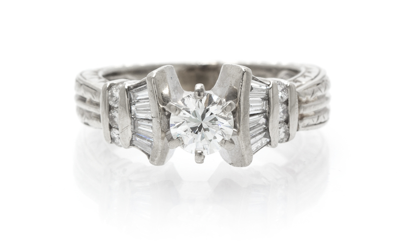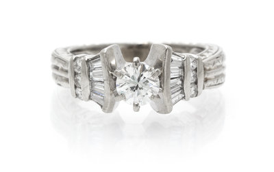 containing one round brilliant cut diamond weighing approximately 0.49 carat, eight tapered baguette cut diamonds weighing approximately 0.28 carat total and six round brilliant cut diamonds weighing approximately 0.06 carat total.Stamp: 14.