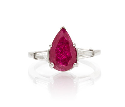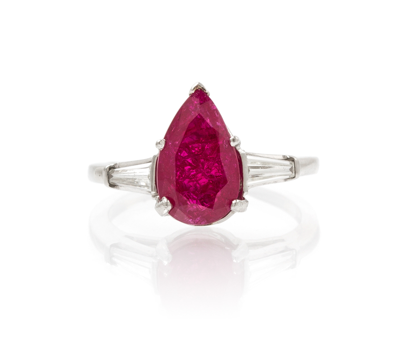 containing one pear shape mixed cut quench crackled synthetic ruby weighing approximately 2.35 carats and two tapered baguette cut diamonds weighing approximately 0.36 carat total.Stamp: 10%IRIDPLA.