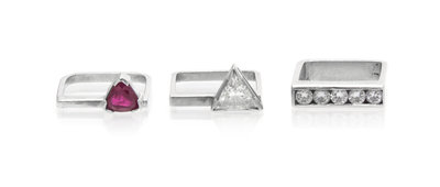 containing one triangular mixed cut ruby measuring approximately 6.00 x 5.80 x 3.44 mm, one triangular brilliant cut diamond weighing approximately 1.30 carats and five round brilliant cut diamonds weighing approximately 0.60 carat total.