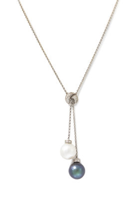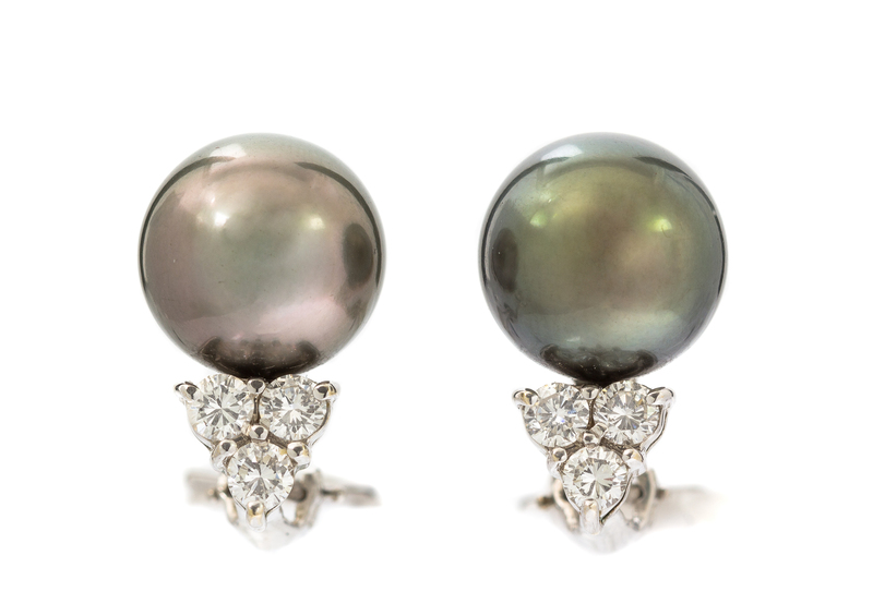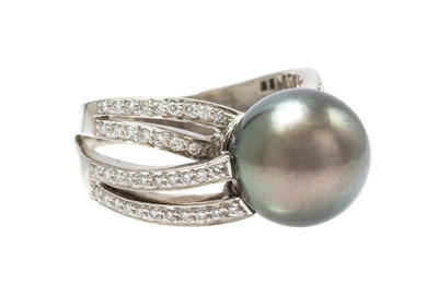 consisting of an 18 karat white gold ring containing one Tahitian pearl measuring approximately 12.40 mm in diameter and 74 round brilliant cut diamonds weighing approximately 0.74 carat total, a pair of earclips containing two Tahitian pearl measuring approximately 11.86-11.96 mm in diameter and six round brilliant cut diamonds weighing approximately 0.72 carat total, together with a lariat necklace containing one Tahitian pearl measuring approximately 10.82 mm in diameter, one pearl measuring approximately 10.74 mm in diameter and 32 round brilliant cut diamonds weighing approximately 0.32 carat total.Ring stamp: 750.