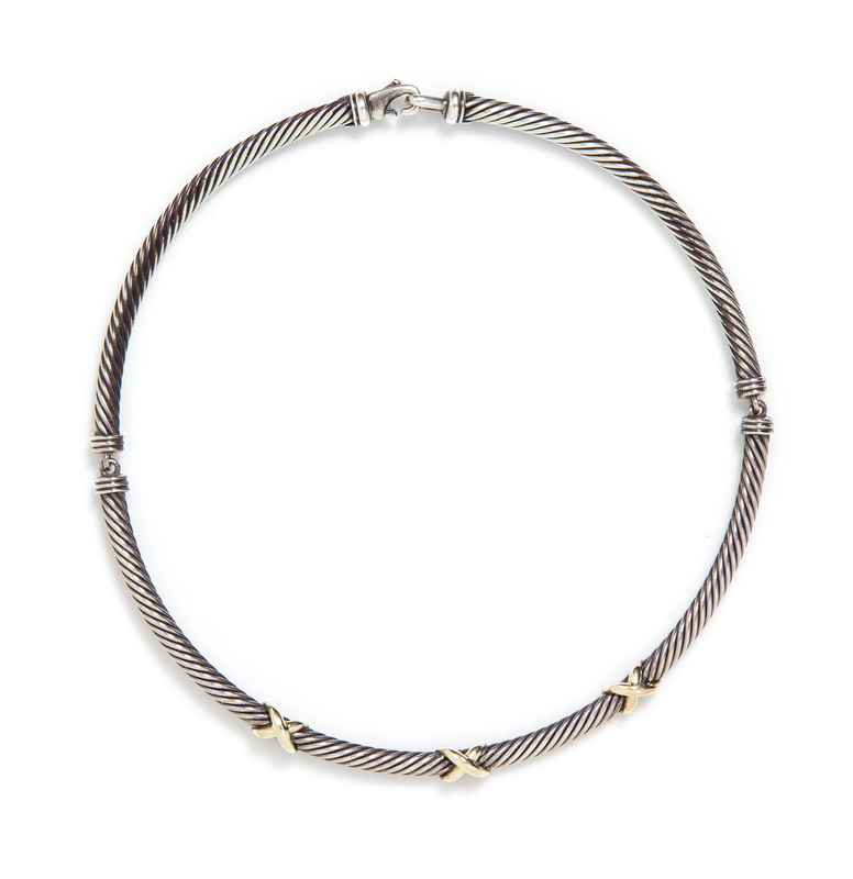 comprised of three sterling silver cable sections with three applied yellow gold "x" accents.Stamp: 585 925 D. YURMAN.With accompanying signed pouch.