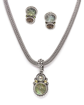 consisting of a silver pendant containing one round carved rock crystal cabochon and one mabe pearl suspended from a silver mesh necklace, together with a pair of silver earrings containing two oval carved labradorite cabochons, two oval mixed cut citrines and four round cut labradorite.Necklace stamp: Stephen Dweck Sterling.Earrings stamp: Stephen Dweck 925.