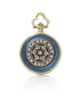 27.00 mm case diameter, matte gilt dial, Arabic numerals, blued steel moon hands, subdial for seconds at 6 o'clock, grey-blue and white enamel bezel, the scalloped bow accented in white enamel, the reverse surmounted with a platinum openwork plaque containing 37 rose cut diamonds over translucent grey-blue enamel on an intricately engraved ground, stem wound and set mechanical movement.
