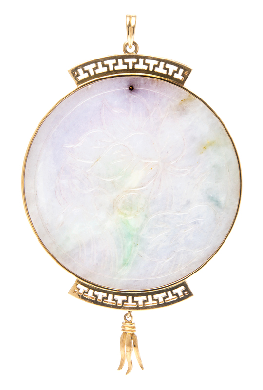 containing one mottled light green and lavender jade disk carved with floral designs measuring approximately 55.00 mm in diameter.Stamp: 14K H.K. A.