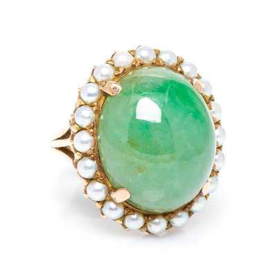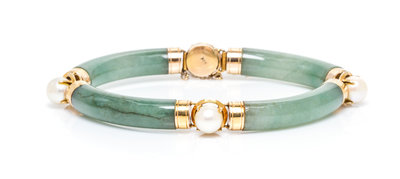 consisting of a ring containing one oval cabochon cut jade measuring 15.47 x 18.41 mm surrounded by 20 seed pearls, a pair of pearl stud earrings with removable geometric enhancers set with two oval cabochons cut jade measuring 10.40 x 15.30 mm, together with a bracelet comprised of four sections of jade capped with yellow gold and four pearls measuring 7.22 mm in diameter.