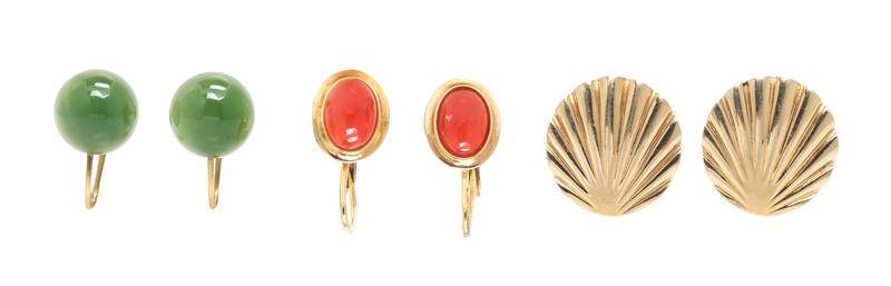consisting of a pair of shell motif earrings, a pair of earrings containing two cabochon cut coral; measuring approximately 8.10 x 6.18 mm, and one pair of screwback earrings containing two cabochon cut jade measuring approximately 9.88 mm in diameter.Stamp: 14K.