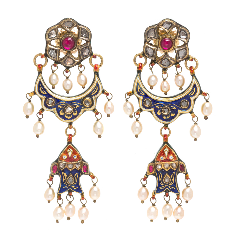 in a Mughal style, containing lasque cut diamonds, cultured pearls, synthetic cut rubies and polychrome enamel in foliate motifs, reverse side depicting a floral and fish motif in polychrome enamel.