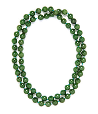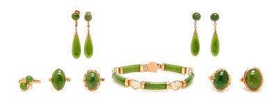 consisting of a necklace containing numerous nephrite beads measuring approximately 9.99-10.14 mm in diameter strung knotted in an endless style, a bracelet comprised of five sections of nephrite jade finished with gold caps and pierce links, four gold rings containing oval cabochon cut nephrite, one ring containing two round nephrite beads, and two pairs of earrings with polished nephrite jade drops.