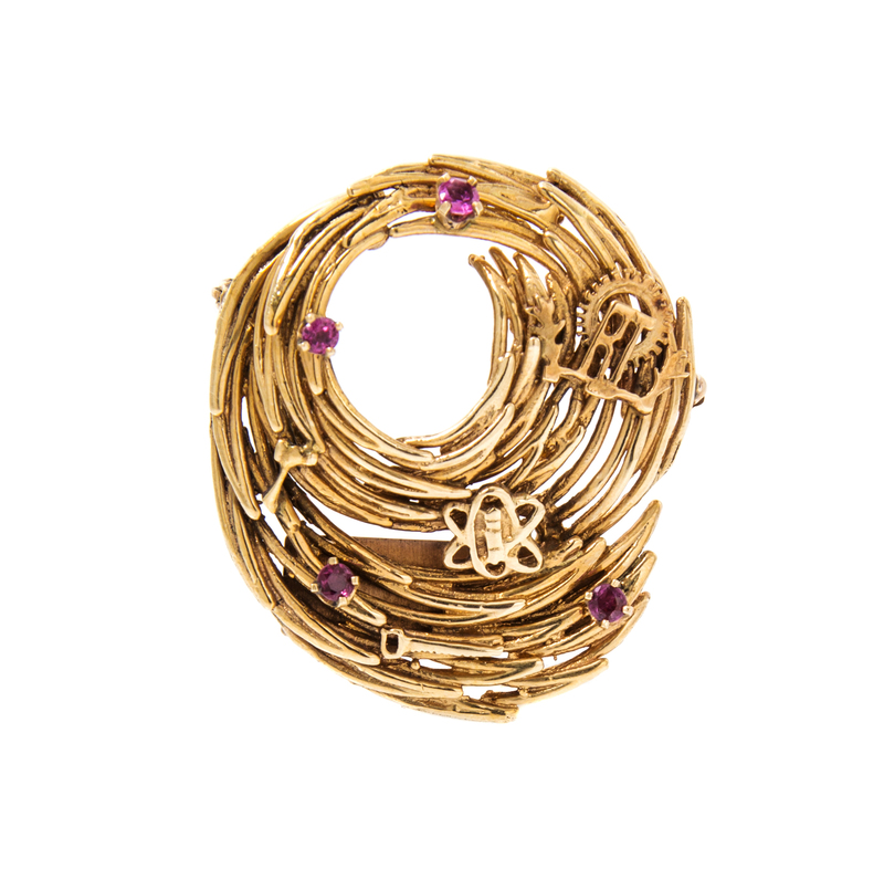 in a swirl motif with attached gold ORT, hammer, saw and science symbol, and containing four round cut rubies weighing approximately 0.32 carat total.Stamp: 14K.