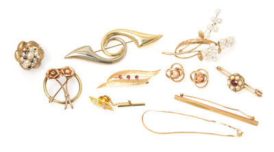 consisting of a pair of 14 karat gold and coral earrings in an interlocking circle design with rope pattern, yellow gold pearl and sapphire cluster ring with textured gold border, a 14 karat yellow gold chain bracelet, a 14 karat gold, amethyst and seed pearl bar brooch, a yellow gold engraved bar brooch, 14 karat gold double trumpet brooch, 14 karat yellow gold floral cultured pearl brooch, a 14 karat yellow gold leaf brooch in a stylized design with florentine finish containing three round cut rubies weighing approximately 0.25 carat total, a 10 karat yellow and rose gold leaf motif pin, and a 14 karat yellow and rose gold circle brooch with two roses containing one seed pearl and one round cut aquamarine.