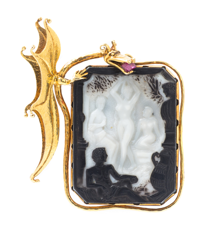 A 14 Karat Yellow Gold, Dyed Agate Cameo and Ruby Dragon Pendant,