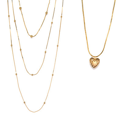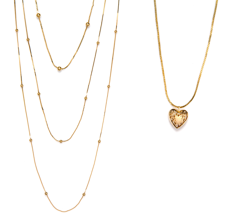 consisting of a three serpentine chain necklaces with gold ball stations together with a heat pendant suspended from a herringbone chain necklace.