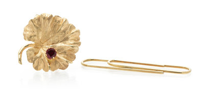 consisting of a leaf motif brooch containing one round mixed cut synthetic ruby measuring approximately 6.40 mm in diameter and one paper clip brooch.Stamp: 14K.