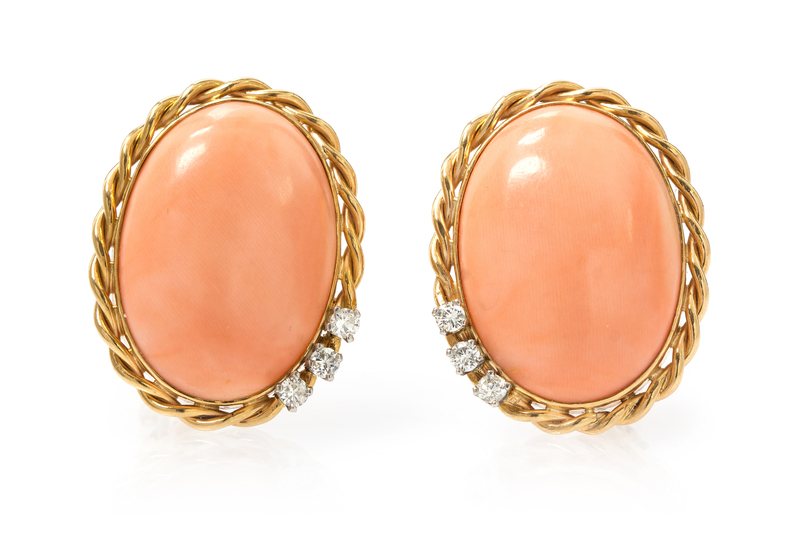 A Pair of Rose Gold, Coral and Diamond Earclips,