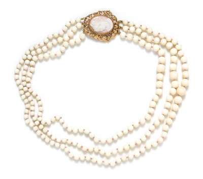 A 14 Karat Yellow Gold, Shell Cameo and Graduated White Coral Multistrand Bead Necklace,