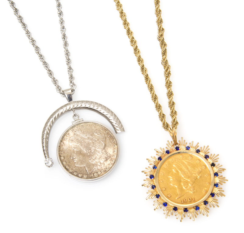 consisting of one 14 karat yellow gold pendant suspending a 1901 US 20 dollar coin with 18 round mixed cut synthetic sapphires suspended from a gold filled French rope chain, together with one 14 karat white gold pendant suspending one 1882 US one dollar coin with one round brilliant cut cubic zirconia suspended from a sterling silver French rope chain.