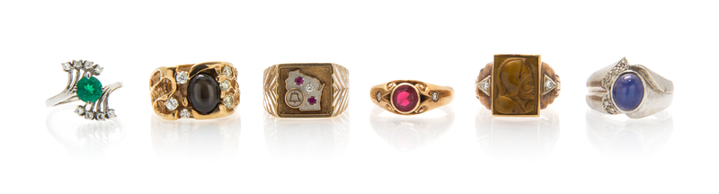 consisting of a rose gold ring containing a synthetic ruby and diamond, a 10 karat white gold containing a synthetic beryl triplet with eight single cut diamonds, a 14 karat two-tone Wisconsin Bell ring containing one round brilliant cut diamond, a 10 karat yellow gold and tiger's-eye cameo ring with two single cut diamonds, a 14 karat white gold synthetic star sapphire ring containing 4 round brilliant cut diamonds weighing approximately 0.28 carat total and a 14 karat yellow gold black star sapphire containing three cubic zirconia and three moissanite.