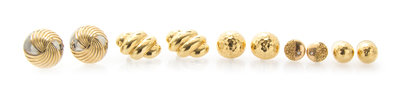 consisting of one pair of round button earclips with spiral design, two pairs of round textured earrings, one pair of round button earrings containing two round single cut diamonds weighing approximately 0.02 carat total, and one pair of lozenge shape earrings.Stamp: 14K.