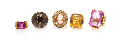 consisting of a ring containing one rectangular cut corner brilliant cut synthetic pink sapphire measuring approximately 23.02 x 16.71 x 7.86 mm, a ring containing one octagonal step cut citrine measuring approximately 20.15 x 16.08 x 10.69 mm, a ring containing one round modified brilliant cut smokey quartz measuring approximately 23.72 x 23.58 x 15.20 mm, together with one ring containing one octagonal step cut synthetic pink sapphire measuring approximately 11.89 x 10.70 x 5.44 mm, together with a 10 karat yellow gold ring containing a carved shell cameo.