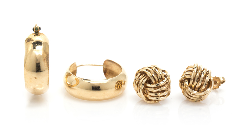 consisting of one pair of hoop earrings and one pair of knot motif earrings with beveled finish.Stamp: 14K.