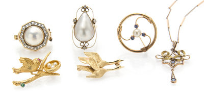 consisting of a yellow gold bird and nest brooch containing three pearls, one round cut emerald and one ruby, a 14 karat gold double fly duck brooch, a 14 karat gold circle brooch containging one pearl and three round cut sapphires, a 14 karat gold ring containing one pear shape mabe pearl and four round brilliant cut diamonds, a 14 karat gold pearl shortner containing two mabe pearls and numerous round brilliant cut diamonds, together with a 10 karat antique swag pendant cotnaining numerous seed pearls and two round cut sapphires suspended from a rolled gold chain.
