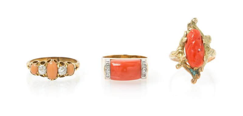 A Collection of Yellow Gold, Coral and Diamond Rings,