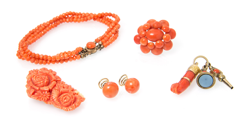 consisting of one triple strand coral bead bracelet measuring approximately 3.65-3.97 mm in diameter, one floral design carved coral brooch, one multi stone coral brooch, a pair of screwable coral buttons and pendant containing a seal, a watch key and a carved coral figa charm.
