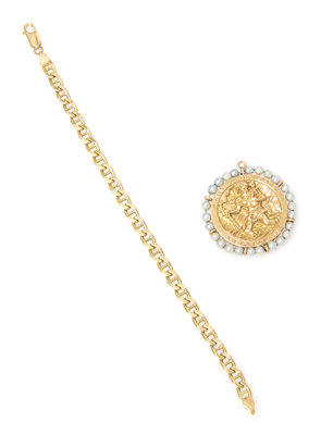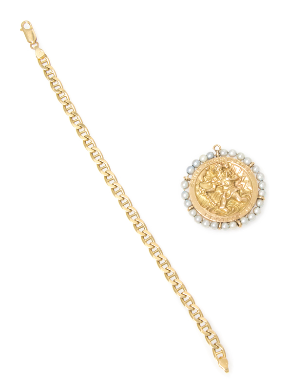consisting of an anchor link bracelet and a St. Christopher's medal pendant bordered with 25 round pearls. Bracelet stamp: 14 KT ITALY (hallmark). Pendant stamp: 14K.