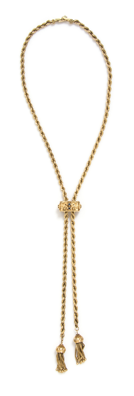 consisting of a rope chain necklace with a slide pendant containing four round cut sapphires and fringe tassel terminals.Stamp: 14K.