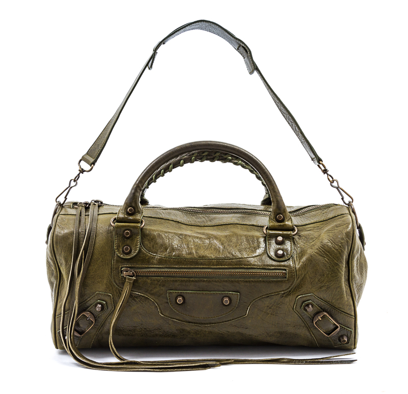 detachable shoulder strap, two top handles, brass studs, zippered top closure with extra long leather pulls, exterior zippered pocket, interior zippered pocket. Stamped: Balenciaga.