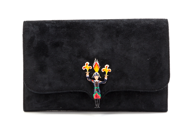 1987,foldover flap with an attached enamel soldier holding fireworks, interior slip and zippered pocket, black suede lining, blindstamp circle Q. Stamped: Hermes.