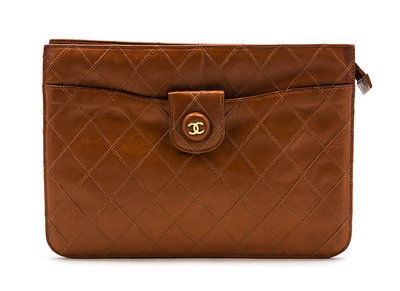circa 1987,slip pocket with interlocking 'C' foldover flap closure, silvertone hardware, zippered top closure, two interior zippered pockets. Stamped: Chanel.